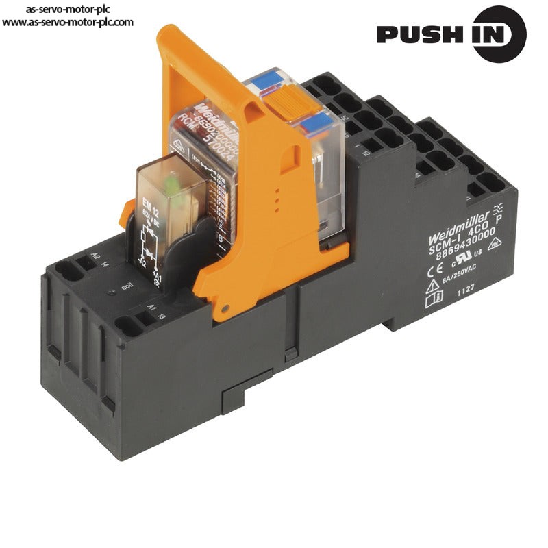 Description:RIDERSERIES RCM, Relay module, Number of contacts: 4, CO contact AgNi, Rated control voltage: 24 V DC, Continuous current: 6 A, PUSH IN, Test button available: Yes